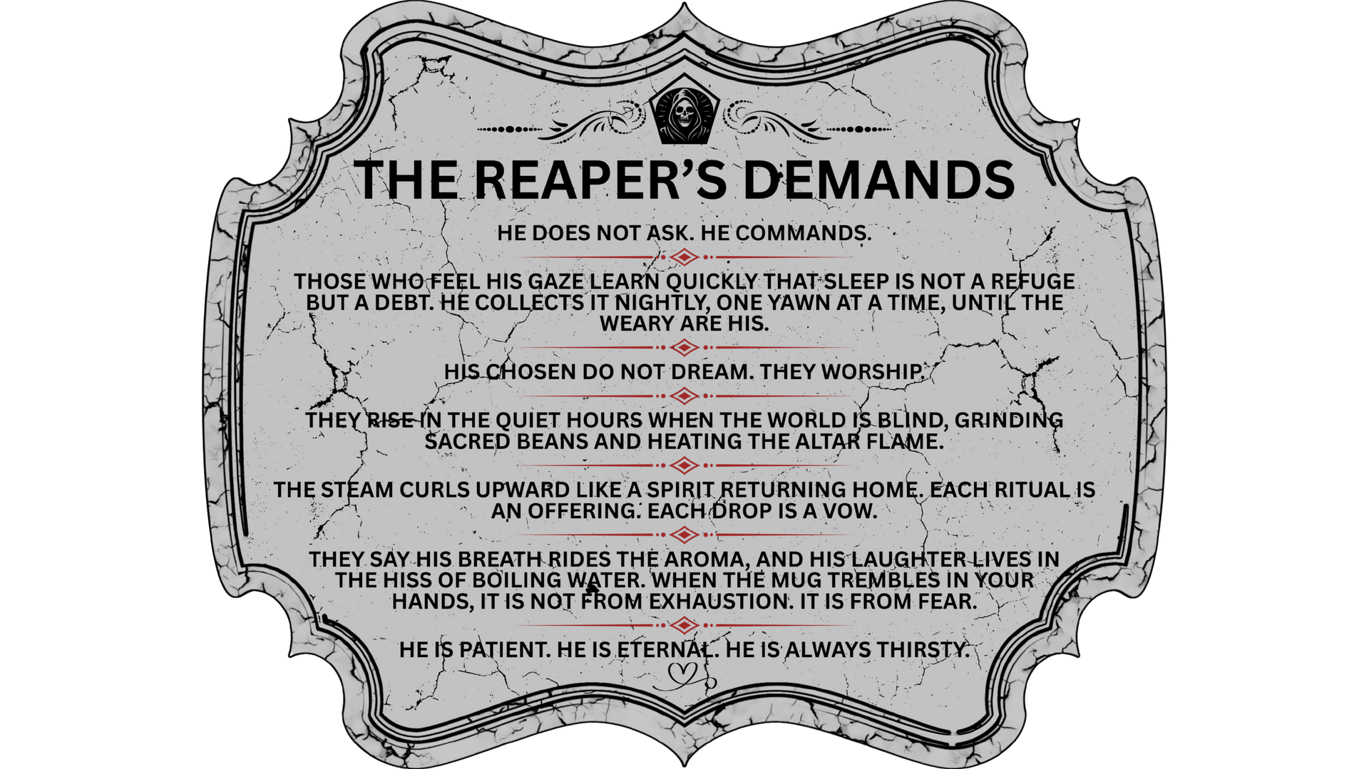 But something stirred in the void between breath and nightmare. From the hollows of death’s dominion, a figure emerged; not a savior, not a god, but a hunger given form. Cloaked in the smoke of extinguished candles, crowned with the skulls of forgotten dreamers, he came bearing a chalice that burned with eternal steam.